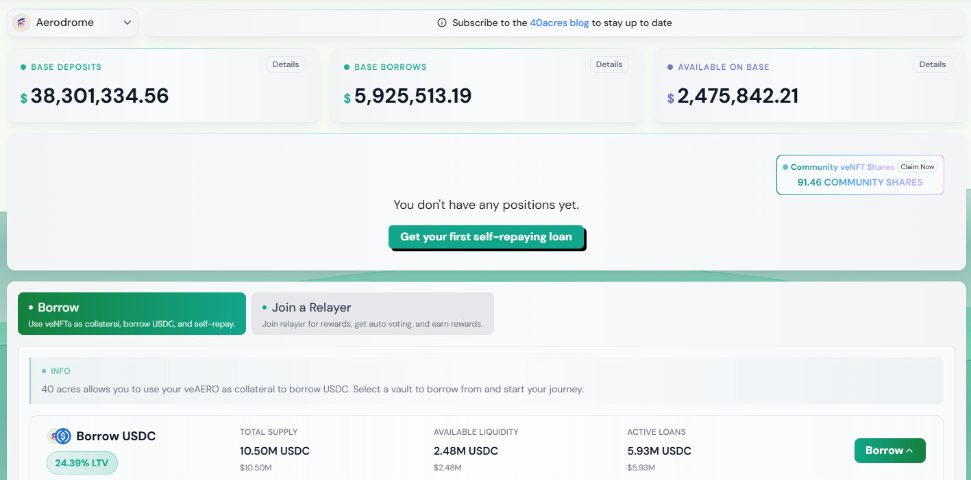 40 acres finance is automatic voting relay app and lending pool against veAERO (self repaying loan without liquidation)